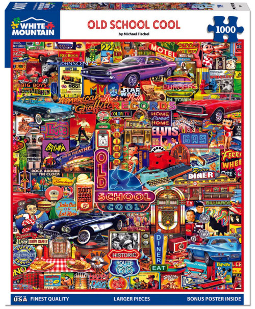 Relive the golden age of Americana with the Old School Cool 1000-piece jigsaw puzzle from White Mountain Puzzles. Artist Michael Fishel brings together a nostalgic collage featuring jukeboxes, neon signs, vinyl records, chrome manual transmissions and other retro treasures reminiscent of a time when you could feed a family of four for $6 and gas was a quarter a gallon. This vibrant, detailed scene offers hours of entertaining puzzling fun and a finished size of 24″ × 30″—ideal for framing or display. Crafted in the USA using premium blue-chipboard, this puzzle features thick durable pieces, crisp random cut design, and a tight interlocking fit. Whether you’re a collector of vintage décor, searching for a USA-made jigsaw puzzle gift, or simply want hours of fun, this puzzle captures the spirit of classic American cool with quality you can see and feel.