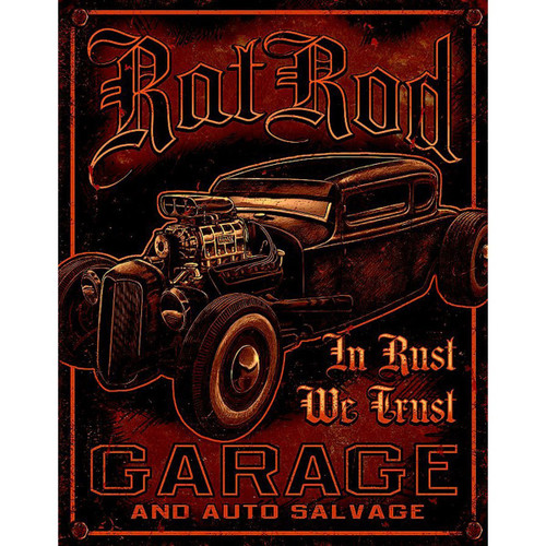 Metal sign that says "Rat Rod Garage. Auto & Salvage. In Rust We Trust."